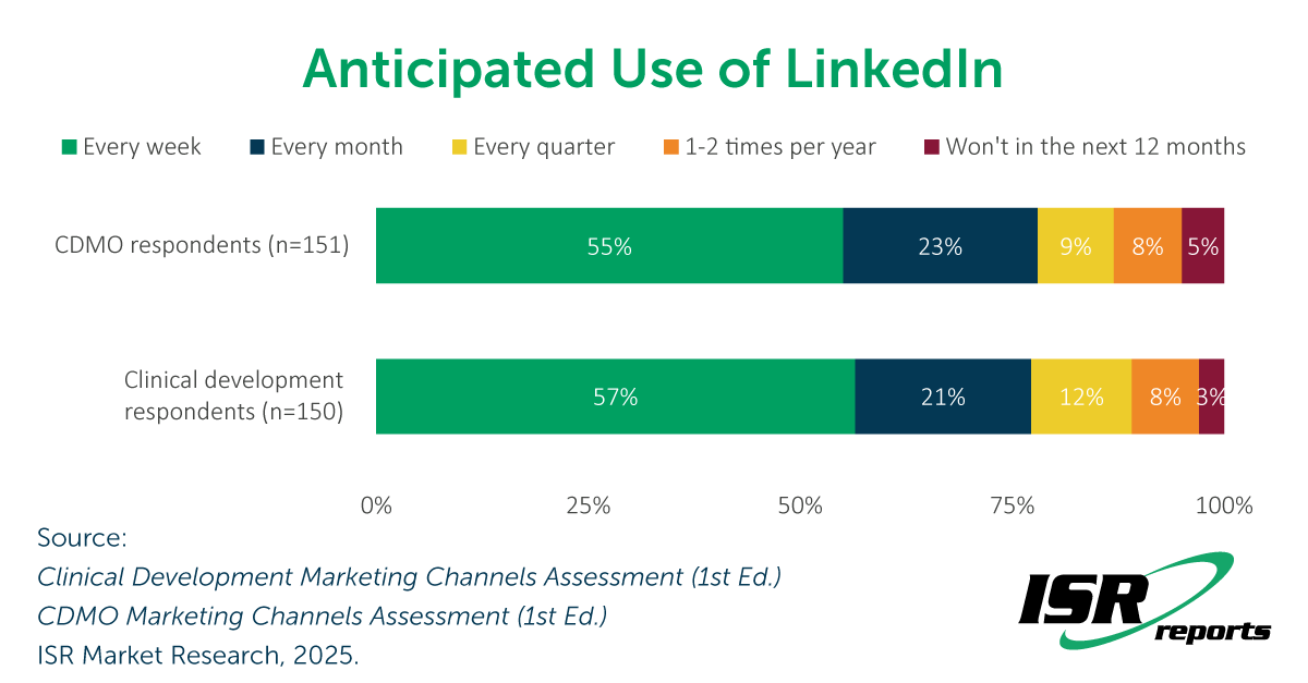 Our Marketing Channels readers will learn what sources pharma respondents are most likely to use, but we won’t keep the big one a secret: 55% of CDMO-focused respondents and 57% of clinical development-focused respondents plan to use LinkedIn every week.