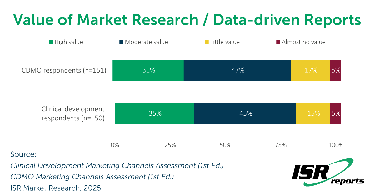 Providers that research their customers’ perspective and translate their findings into impactful content can be more confident about the value they’re delivering. Our Marketing Channels research supports this: Market research / data-driven reports are rated as the most valuable source of information from service providers (31% of CDMO respondents & 35% of clinical development respondents rated as having “high value”).
